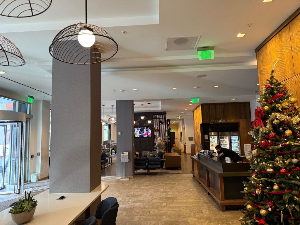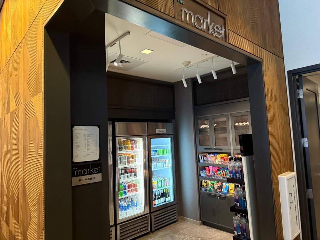 As you walk into the hotel, you are greeted with a lobby, front desk, market, and breakfast area.